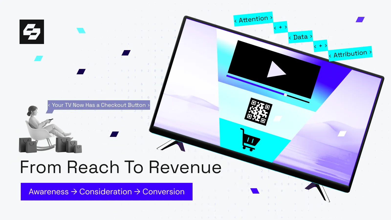 Full-funnel CTV advertising journey from awareness to conversion with shoppable TV and QR code interaction.