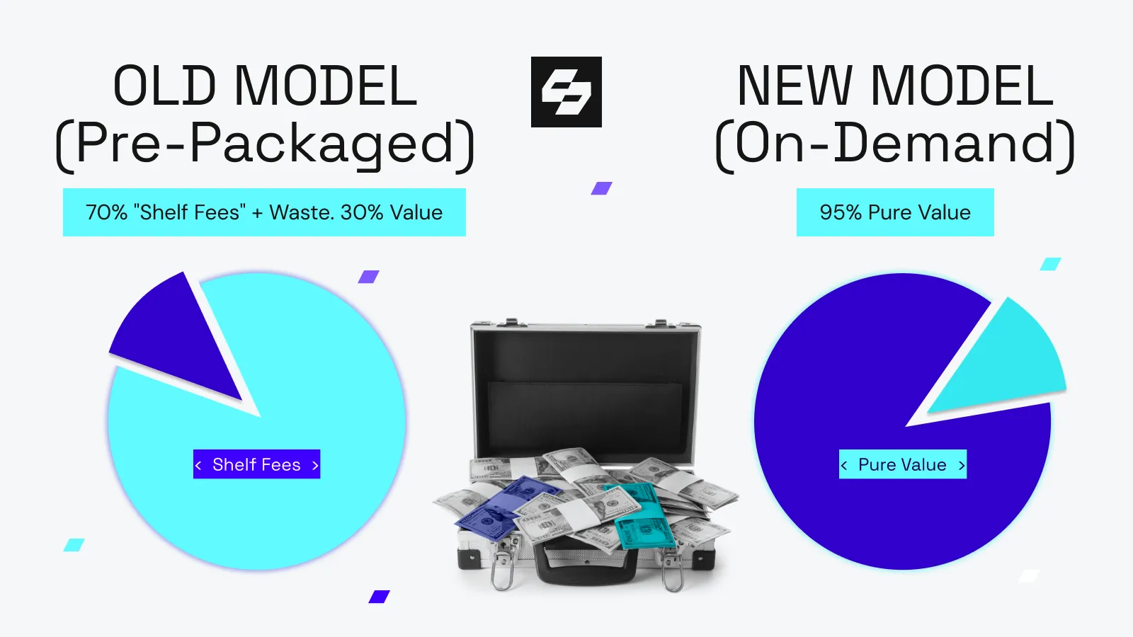 Data tax cost comparison: Chart showing 70% programmatic waste in pre-packaged model vs. 95% value in on-demand curation.