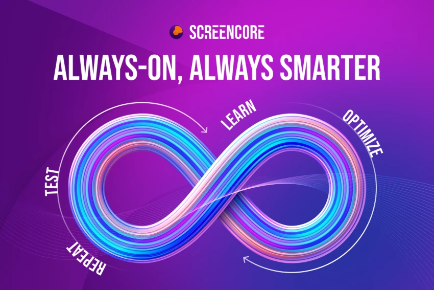 Screencore’s approach is always-on signal testing. The platform runs continuous cycles of experimentation: testing variables, learning from outcomes, applying optimizations, and immediately starting the cycle again. This creates a loop where the system grows smarter every second.
