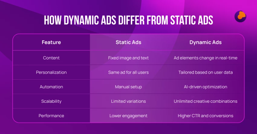 While static ads rely on a one-size-fits-all approach, dynamic ads adapt based on user behavior, browsing history, and context, making them significantly more effective. Here’s how they compare: