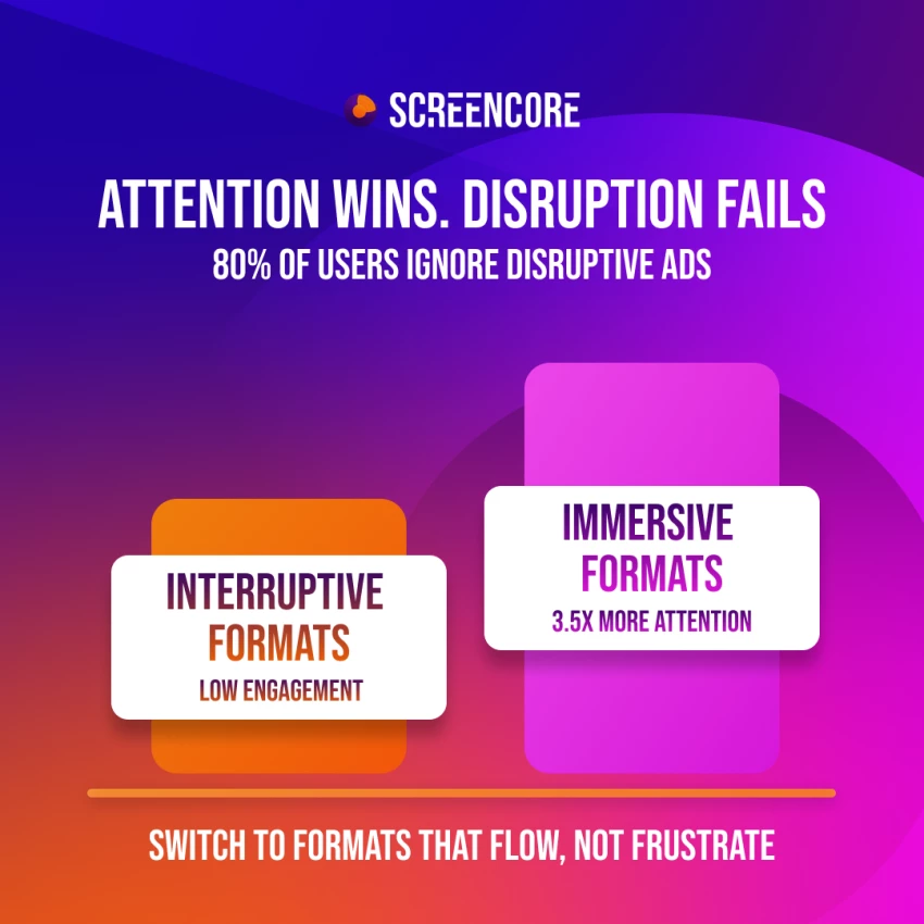 A comparison graphic showing disruptive formats like pop-ups vs immersive options like native video and CTV. This highlights Screencore’s focus on engagement without interruption.