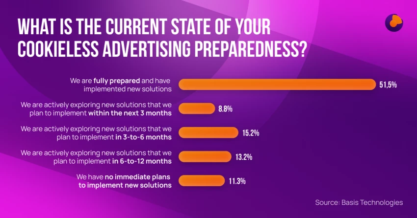 In 2024, signal loss is a pressing issue for all advertisers. According to Basis Technologies survey, 51% of marketers and advertisers feel their organization is fully prepared to succeed in a cookieless world. However, that leaves another 49% who don’t feel fully prepared - some say they’ll be actively exploring new solutions for as long as the next 12 months, and others have no immediate plans to implement new solutions at all. But how they can prepare for the death of cookies?